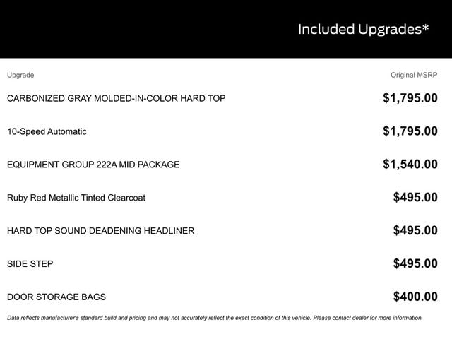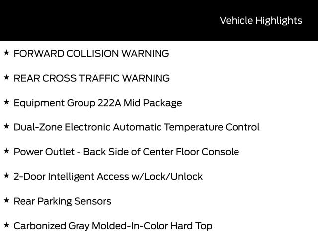 BACK UP CAMERA, BLUETOOTH, HEATED SEATS, REMOTE START, CRUISE CONTROL, POWER WINDOWS, POWER LOCKS, MULTI-ZONE CLIMATE CONTROL, STEERING WHEEL CONTROLS, AWD / 4WD, LANE DEPARTURE WARNING, LANE KEEP ASSIST, APPLE CARPLAY, ANDROID AUTO, FORD SYNC, AUTOMATIC EMERGENCY BRAKING, FORWARD COLLISION WARNING, REAR CROSS TRAFFIC WARNING, 2-Door Intelligent Access w/Lock/Unlock, Ambient Footwell Lighting, Carbonized Gray Molded-In-Color Hard Top, Connected Navigation, Dr & Pass Illuminated Sliding Visor Vanity Mirrors, Dual Smart Charging USB Ports, Dual-Zone Electronic Automatic Temperature Control, Equipment Group 222A Mid Package, Front Row Heated Seats, Hard Top Sound Deadening Headliner, Heated door mirrors, Power Outlet - Back Side of Center Floor Console, Rear Parking Sensors, Rear-Window Defroster & Washer.