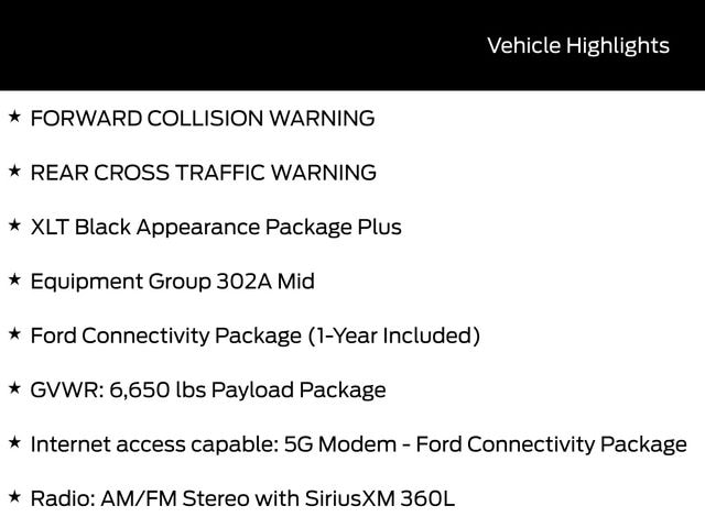 BACK UP CAMERA, BLUETOOTH, HEATED SEATS, TOW PACKAGE / TRAILER HITCH, REMOTE START, CRUISE CONTROL, POWER WINDOWS, POWER LOCKS, STEERING WHEEL CONTROLS, AWD / 4WD, LANE DEPARTURE WARNING, LANE KEEP ASSIST, APPLE CARPLAY, ANDROID AUTO, FORD SYNC, AUTOMATIC EMERGENCY BRAKING, FORWARD COLLISION WARNING, REAR CROSS TRAFFIC WARNING, 4WD, 18" Painted Aluminum Wheels, 3.55 Axle Ratio, 360 Degree Camera, 400W Pro Power Onboard (cab & Bed), 6" Black Running Boards, Adaptive Cruise Control with Stop and Go, AEB Oncoming, Auto-Dimming Rear-View Mirror, Black Exterior Badging, Black Grille, Body-Color Door Handles, Body-Color Front and Rear Bumpers, Chrome Front and Rear Bumpers, Cloth 40/20/40 Front Seat, Dark Interior Appliques, Dual Exhaust with Black Tips, Dual-Zone Electronic Automatic Temperature Control, Equipment Group 302A Mid, Floor Shifter, Ford Co-Pilot360 Assist 2.0, Ford Connectivity Package (1-Year Included), Front Parking Sensors, Gray Box Side Decal, GVWR: 6,650 lbs Payload Package, Heated Front Seats, Intelligent Access with Push Button Start, Internet access capable: 5G Modem - Ford Connectivity Package, Power Glass Heated Sideview Mirrors, Power-Sliding Rear Window, Radio: AM/FM Stereo with SiriusXM 360L, Remote Start System with Remote Tailgate Release, SYNC 4 with Enhanced Voice Recognition, Towing Technology, Wheels: 20" Gloss Black Painted Aluminum, Wrapped Steering Wheel, XLT Black Appearance Package Plus.