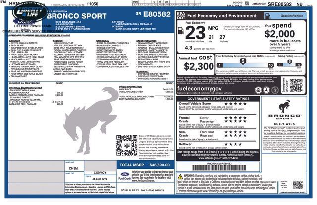 Gray Metallic 2025 Ford Bronco Sport Badlands 4WD 8-Speed Automatic EcoBoost 2.0L I4 GTDi DOHC Turbocharged VCT 21/27 City/Highway MPG