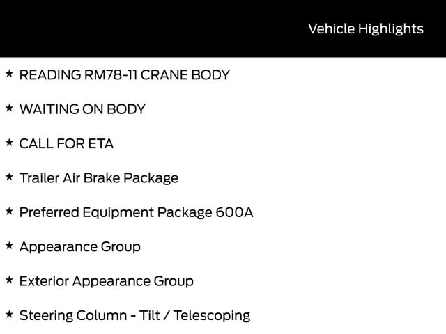 BACK UP CAMERA, BLUETOOTH, CRUISE CONTROL, POWER WINDOWS, POWER LOCKS, STEERING WHEEL CONTROLS, AWD / 4WD, FORD SYNC, READING RM78-11 CRANE BODY, WAITING ON BODY, CALL FOR ETA, Appearance Group, Body Builder Wiring - At Back of Cab, Combined, Chromed Fender Badge, Engine Exhaust Brake, Exterior Appearance Group, Four Body Builder Switches - Mounted in Center Instrument Panel, Intelligent Oil Life Monitor, Lights - Roof Marker/Clearance - Amber Lenses, 5 Lights, Manual Regen Initiation - Driver Interface in Message Center, Preferred Equipment Package 600A, Steering Column - Tilt / Telescoping, Trailer Air Brake Package.