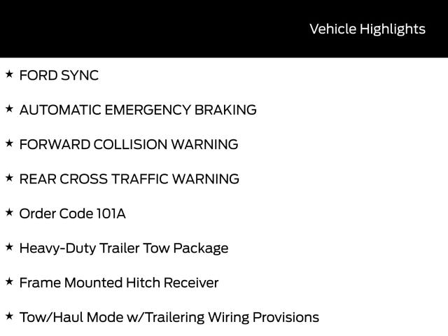 BACK UP CAMERA, BLUETOOTH, CRUISE CONTROL, POWER WINDOWS, POWER LOCKS, STEERING WHEEL CONTROLS, LANE DEPARTURE WARNING, LANE KEEP ASSIST, FORD SYNC, AUTOMATIC EMERGENCY BRAKING, FORWARD COLLISION WARNING, REAR CROSS TRAFFIC WARNING, Frame Mounted Hitch Receiver, Heavy-Duty Trailer Tow Package, Order Code 101A, Tow/Haul Mode w/Trailering Wiring Provisions. Priced below KBB Fair Purchase Price!