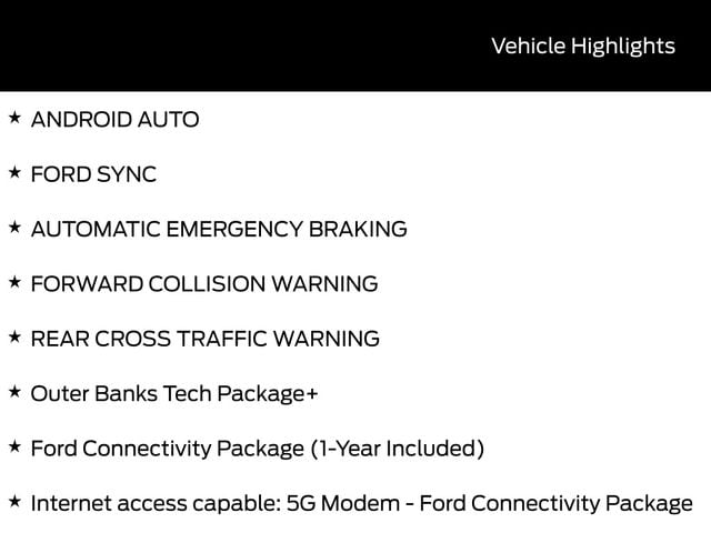 SUNROOF / MOONROOF, LEATHER SEATS, BACK UP CAMERA, BLUETOOTH, HEATED SEATS, REMOTE START, PREMIUM WHEELS, CRUISE CONTROL, POWER WINDOWS, POWER LOCKS, MULTI-ZONE CLIMATE CONTROL, STEERING WHEEL CONTROLS, AWD / 4WD, LANE DEPARTURE WARNING, LANE KEEP ASSIST, APPLE CARPLAY, ANDROID AUTO, FORD SYNC, AUTOMATIC EMERGENCY BRAKING, FORWARD COLLISION WARNING, REAR CROSS TRAFFIC WARNING, Connected Navigation (1-Year Included), Ford Connectivity Package (1-Year Included), Internet access capable: 5G Modem - Ford Connectivity Package, Outer Banks Tech Package+, Radio: HD w/B&O Sound System by Bang & Olufsen. Recent Arrival! 25/30 City/Highway MPG