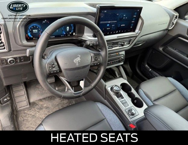 I got a 2025 Big Bend with the black diamond off road package. The steel modular front and rear in combination with bush guard gives this year model. A very aggressive off road look. With the ability to easily mount accessories and power them with the factory installed auxiliary switches. Hitch receiver seamlessly mounted into the rear steel bumper flanked by some very chunky recovery points. The upgraded aluminum rims wrapped with Continental all-terrains. It make this the most capable bronco sport yet. The interior of the 2025 has been updated with a new 13 inch touchscreen with Android Auto and apple car play. The lines of the dash flow elegantly from the new infotainment screen to the new all digital 12 inch gauge chaster. Toggling through the different modes on the gauge chaster is very intuitive, and all the displays are laid out very cleanly. Moving from gauge chaster the center storage cubby just below the infotainment screen there is a wireless charger and USB/ USB-c ports. The passenger side of that same cubby gets a handle and a matching one on the roof just in case the driver bucks a little too much. The passenger also gets a mesh storage area. That leads us to the fact this vehicle has tons of storage options all throughout. You have pockets on the sides of the front two seat big enough for the latest new phones. Very generous door storage on all four doors plus huge glove box and center console with 12 volt outlet. The back side of the center console has air vents and another 12 volt outlet plus a 110 outlet. Now getting to the cargo area it is massive for a crossover SUV. With off road package you get a cargo management system and a very nice rubber mat. Under that there is a full size tire plus scissor jack and funnel to use with the capless filler system. On the liftgate there isa pair of very bright led lights turned on with a switch in the cargo area. This feature packed vehicle has tons awesome gadgets and hidden a little homages I spend all day just talk that. At the end of the day it is car. So how does it drive. It is wonderful, the steering and pedal response is beautiful. Rides very smooth and little to no road noise going down the highway. The active cruise control and co-pilot 360 have been very handy. The car literally drives itself most of the time. There is not enough good things I could same about this car. I love it and you pick one too. You will see what I mean.