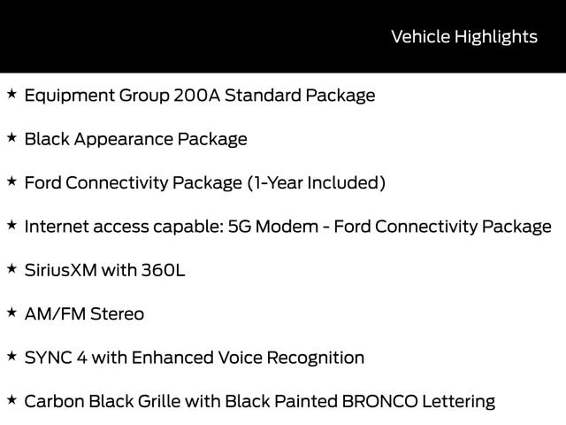 The Black Appearance Package adds a bold and distinct look, with a textured matte black hood graphic, unique black-accented badges, a painted Shadow Black roof, and 17-inch matte black-painted aluminum wheels. This Bronco Sport also comes equipped with the Ford Connectivity Package, providing seamless integration with your digital world.