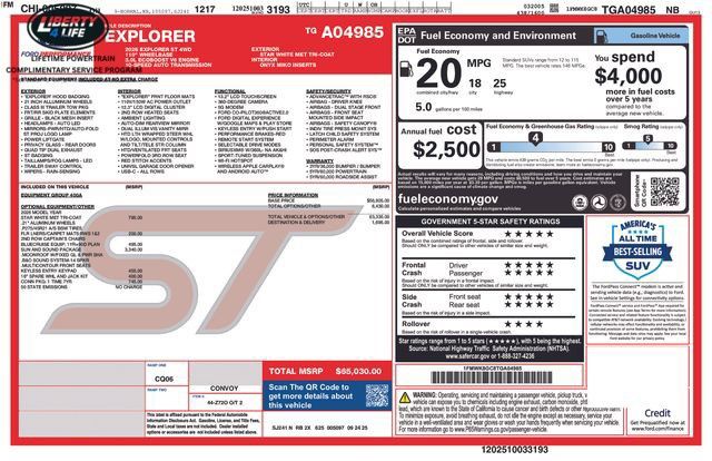 White Metallic 2026 Ford Explorer ST 4WD 10-Speed Automatic 3.0L EcoBoost V6 18/25 City/Highway MPG