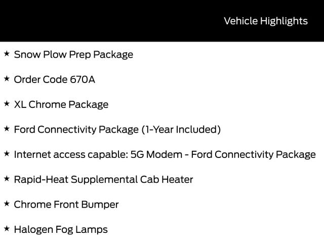BLUETOOTH, TOW PACKAGE / TRAILER HITCH, REMOTE START, CRUISE CONTROL, POWER WINDOWS, POWER LOCKS, STEERING WHEEL CONTROLS, AWD / 4WD, LANE DEPARTURE WARNING, LANE KEEP ASSIST, APPLE CARPLAY, ANDROID AUTO, FORD SYNC, AUTOMATIC EMERGENCY BRAKING, FORWARD COLLISION WARNING, REAR CROSS TRAFFIC WARNING, 4WD, 410 Amp Dual Alternators, Chrome Front Bumper, Chrome Rear Step Bumper, Ford Connectivity Package (1-Year Included), Halogen Fog Lamps, Internet access capable: 5G Modem - Ford Connectivity Package, Order Code 670A, Rapid-Heat Supplemental Cab Heater, Snow Plow Prep Package, XL Chrome Package.