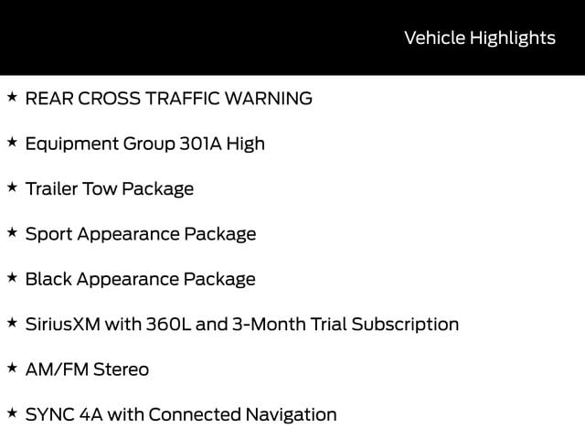 - ANDROID AUTO, APPLE CARPLAY, AUTOMATIC EMERGENCY BRAKING, AWD / 4WD, BACK UP CAMERA, BLUETOOTH, CRUISE CONTROL, FORD SYNC, FORWARD COLLISION WARNING, LANE DEPARTURE WARNING, LANE KEEP ASSIST, POWER LOCKS, POWER WINDOWS, REAR CROSS TRAFFIC WARNING, REMOTE START, STEERING WHEEL CONTROLS, TOW PACKAGE / TRAILER HITCH