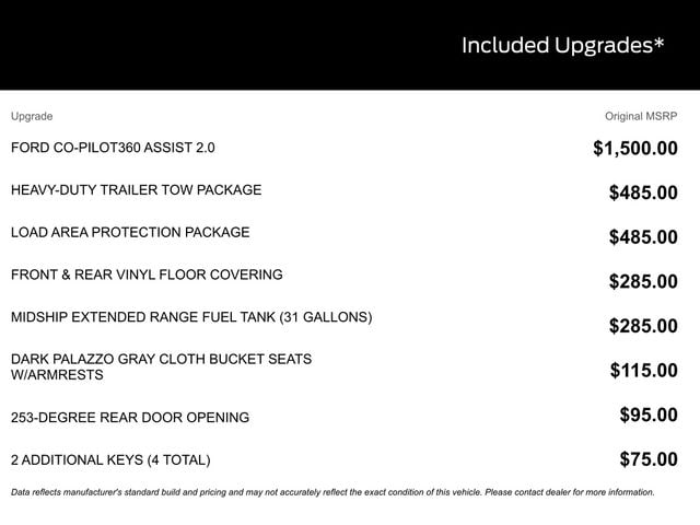 Step inside and discover the comfort and connectivity of the Dark Palazzo Gray Cloth Bucket Seats with Armrests, SYNC 4 infotainment system, and a host of other premium features. With the 253-Degree Rear Door Opening and 6 Cargo Tie-Down Hooks, loading and unloading your cargo has never been easier.