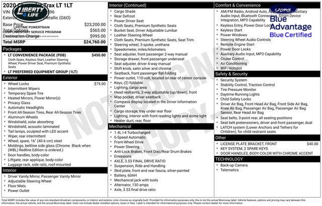 This Trax LT has been meticulously inspected and certified by our team of automotive experts, ensuring you can drive with confidence. With its impressive list of features, exceptional fuel efficiency, and uncompromising safety, this 2020 Chevrolet Trax LT is the perfect companion for your next adventure.